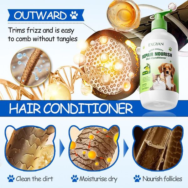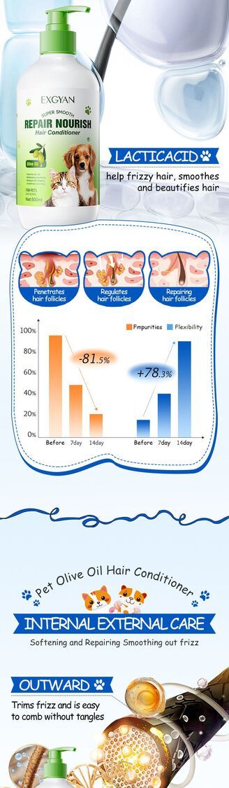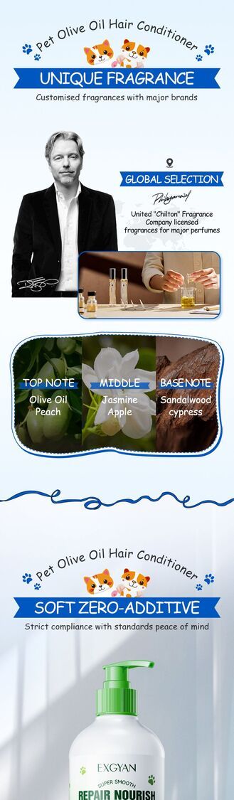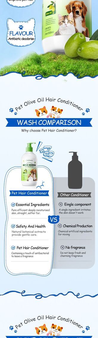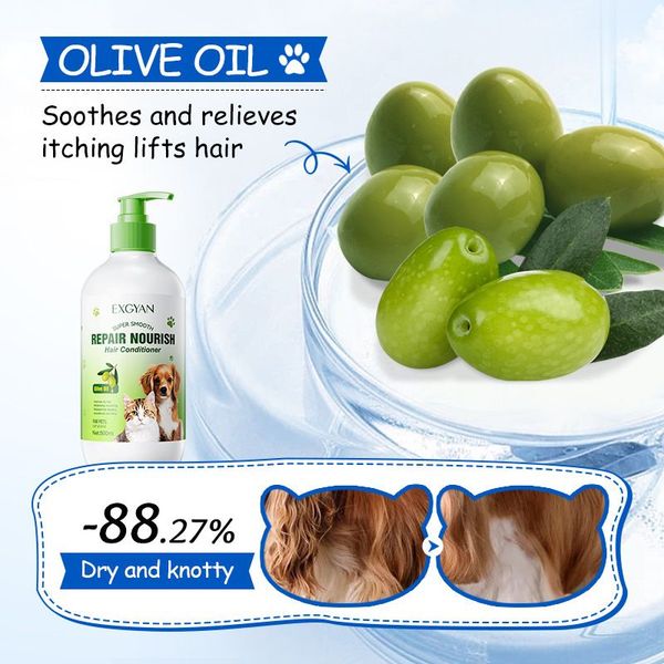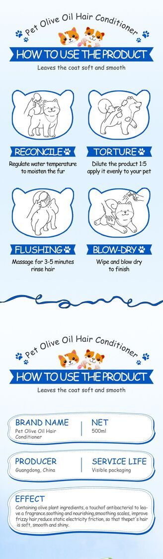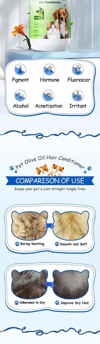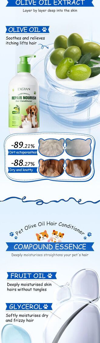 蘊含橄欖植物成分,淡淡的抗菌香味,舒緩滋養,撫平毛鱗片,改善毛躁,減少靜電摩擦,令寵物毛髮柔軟順滑,光澤亮麗。