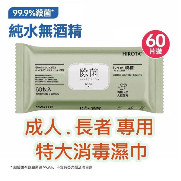 HIROTA-消毒成人濕紙巾 - 60 抽加蓋裝 成人長者專用 特大加厚版 [大張過A4紙] 33x23cm (純水淨化, 不含 BIT, Paraben, 酒精)