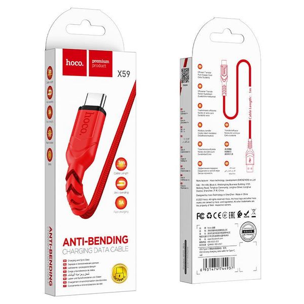 hoco.-高品質 Type-C 快充線 1米 USB 接口 3A X59 紅色 防彎快速充電及數據傳輸