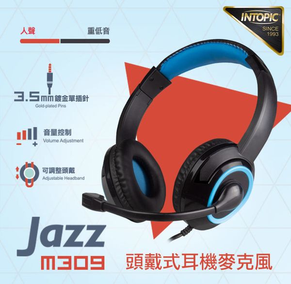 INTOPIC-[台灣品牌] JAZZ-M309 人體工學 頭戴式耳機麥克風 3.5mm*1 附贈音源轉接線,手機/PC兩用