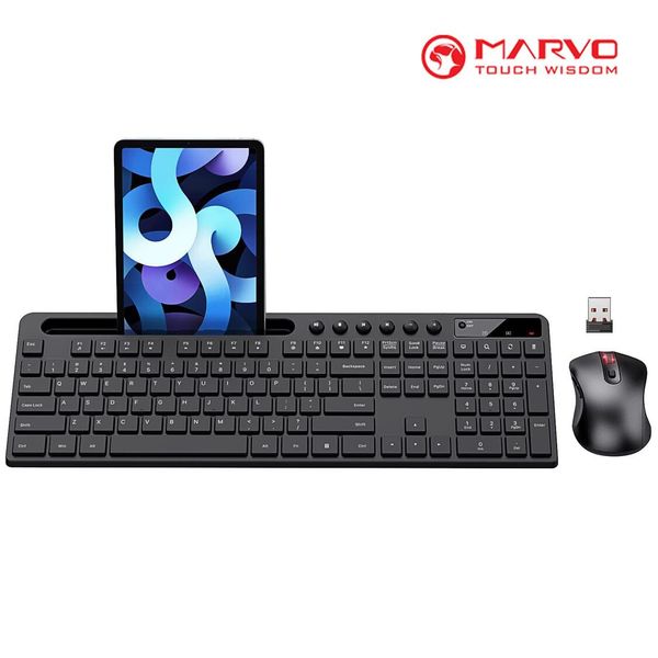 Marvo-無線鍵盤和滑鼠組合,MARVO KC411W 2.4G 人體工學無線電腦鍵盤,附手機平板電腦支架,靜音滑鼠6鍵 相容於 MacBook,Windows (黑色)