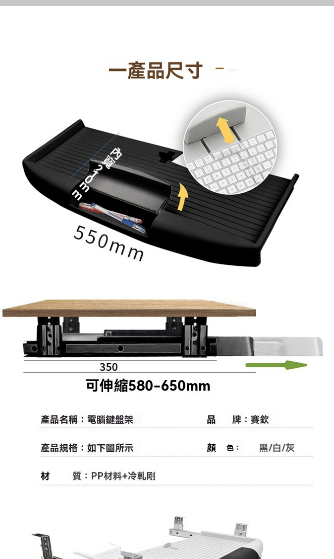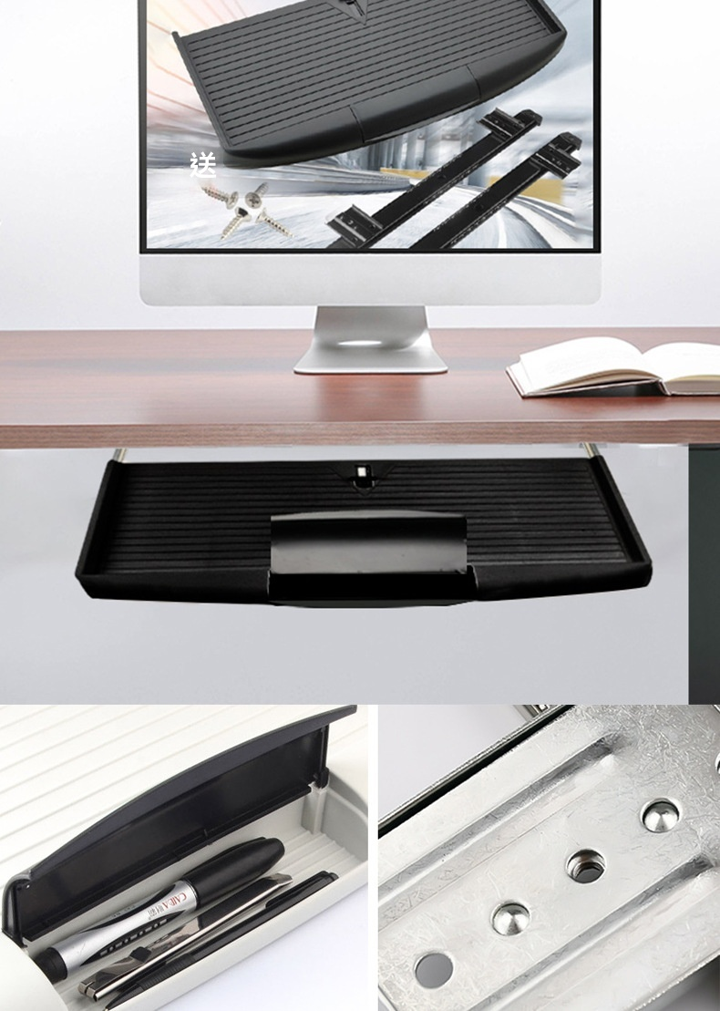 適用於市面常用的標準鍵盤,確定好托架位置後用縲絲固定在桌子,安裝簡單。