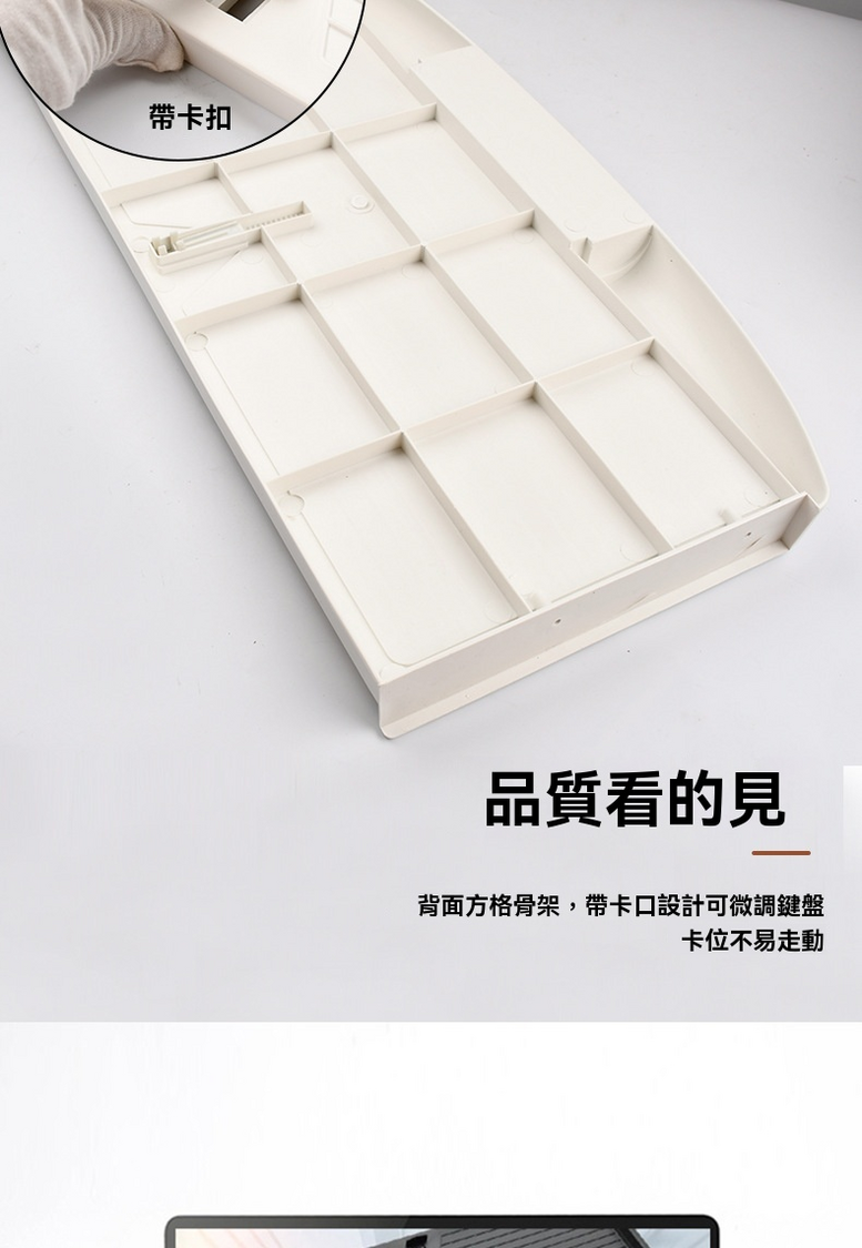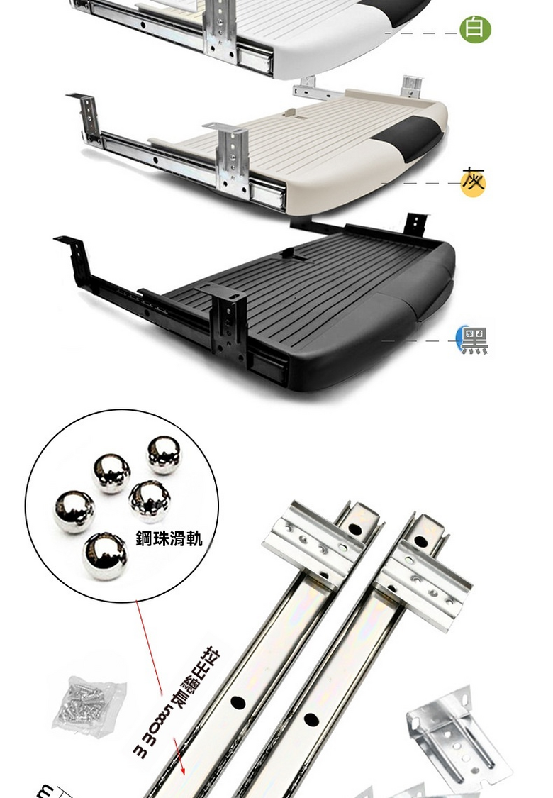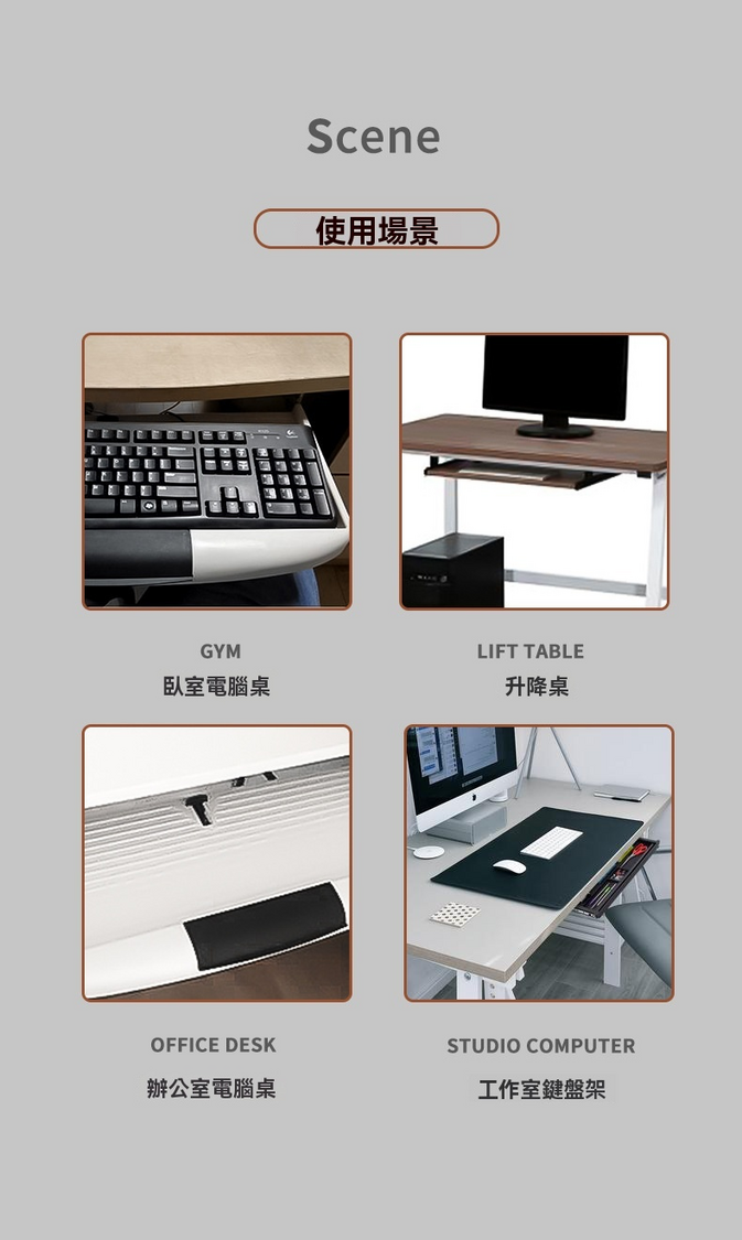 適用於市面常用的標準鍵盤,確定好托架位置後用縲絲固定在桌子,安裝簡單。