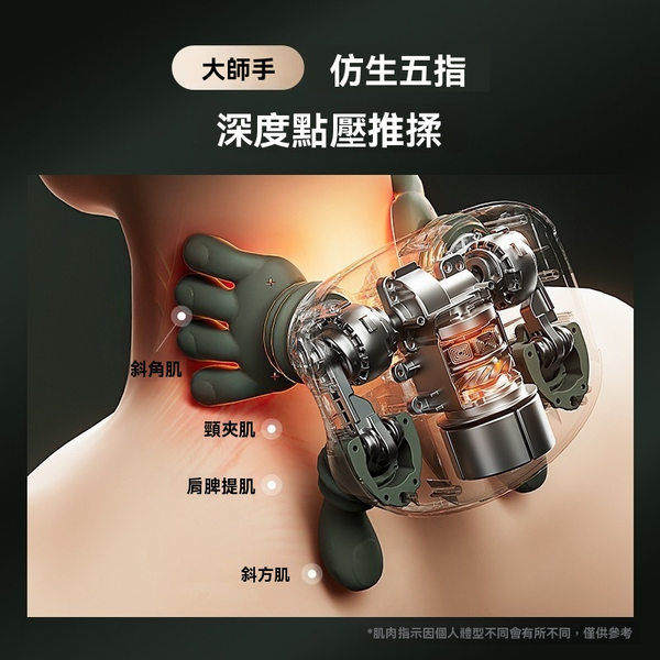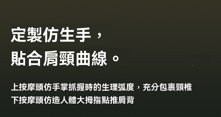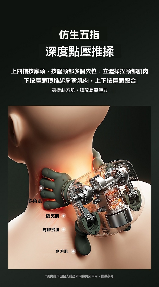 上四指按摩頭,按壓頸部多個穴位,立體揉捏頸部肌肉下按摩頭頂推起肩背肌肉,上下按摩頭配合, 夾揉斜方肌,釋放肩頸壓力/斜角肌/頸夾肌/肩胛提肌/斜方肌