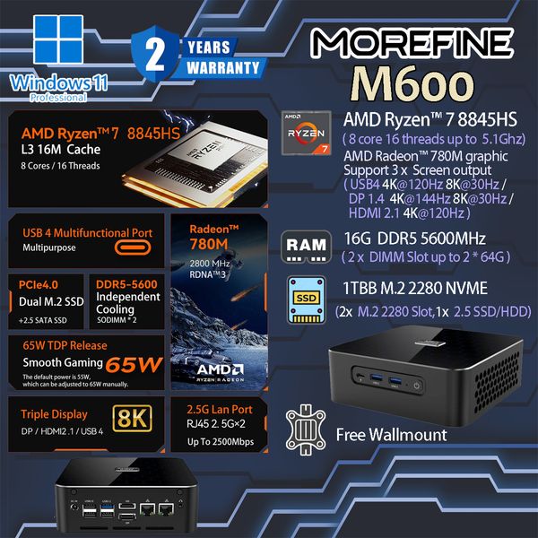 Morefine 摩方 M600 R7-8845HS 16G LPDDR5 1TB M.2 WIFI6 BT5 WIN11 PRO Mini PC 迷你電腦