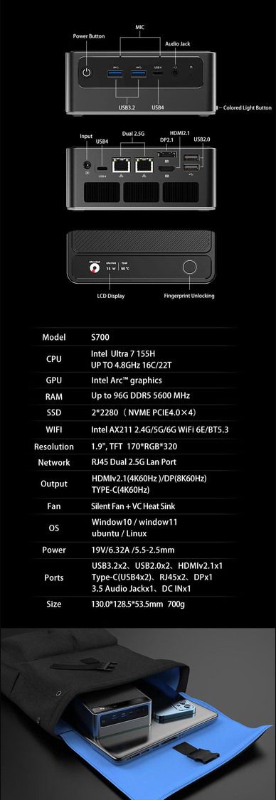 Morefine 摩方 S700 Ultra 7 155H 32G DDR5 1TB M.2 WIFI6 BT5.3 WIN11 PRO Mini PC 迷你電腦