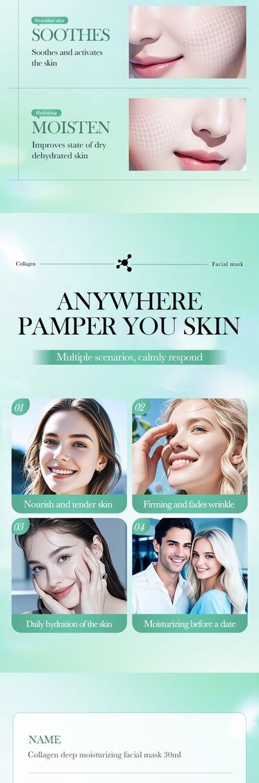 舒緩並活化肌膚,改善乾燥缺水肌膚狀態,緊緻肌膚,淡化皺紋,煥活肌膚,提升肌膚彈性