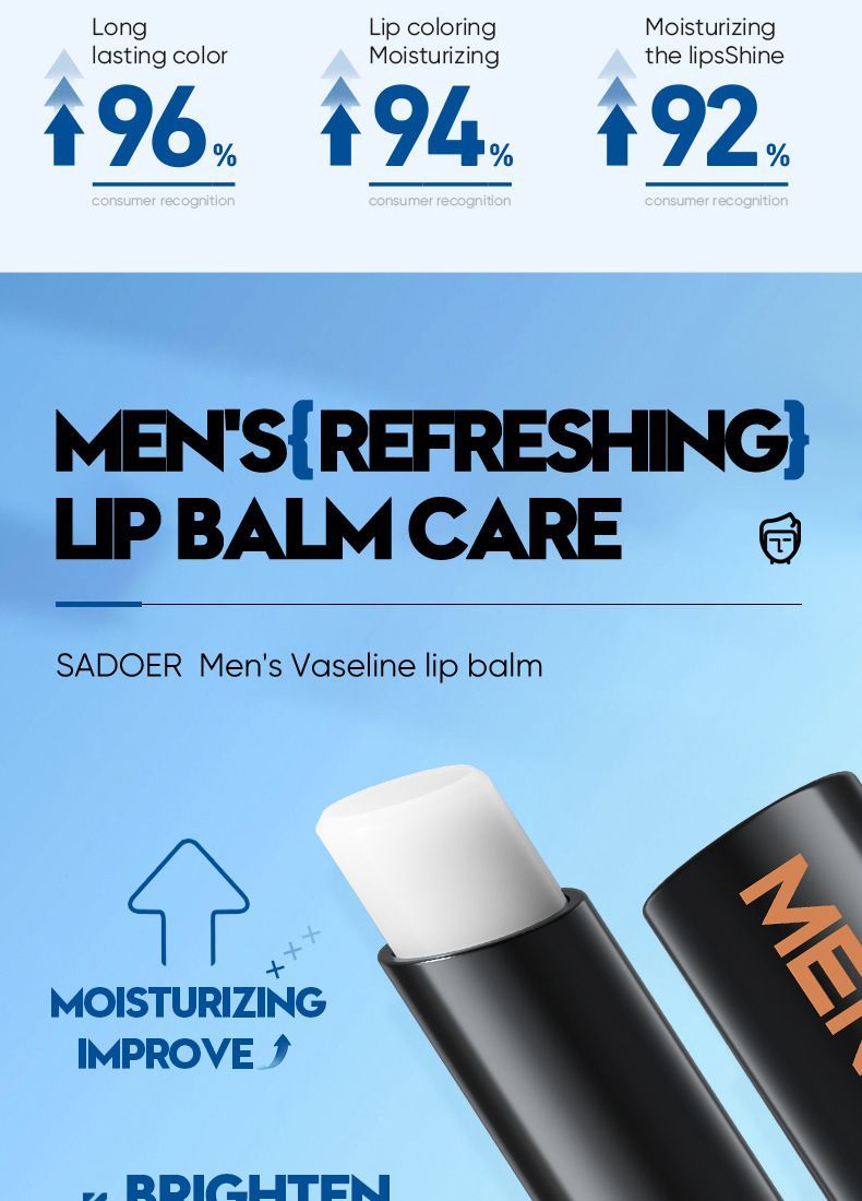 滋潤滋養雙唇,改善乾燥、粗糙、暗沉的唇部狀況,淡化唇紋,提亮唇色,令雙唇水潤柔軟,不干燥,展現男士魅力。