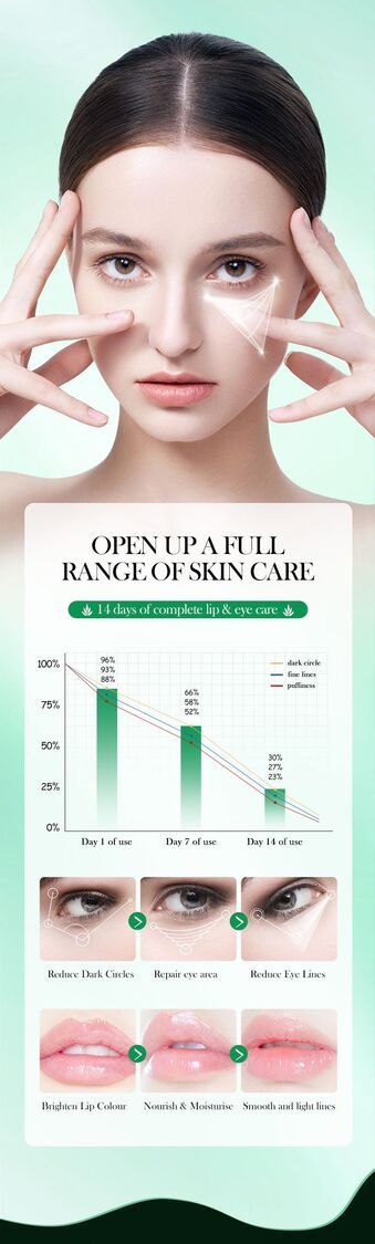 滋潤並滋養眼周肌膚,淡化細紋和黑眼圈;滋潤雙唇,減少唇紋,提亮唇色