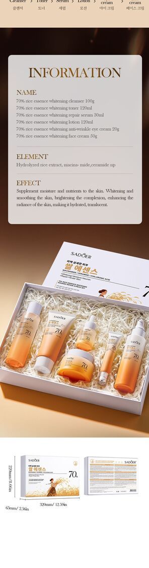 質地清爽不油膩,易於吸收。溫和塗抹,為肌膚補充所需水分。富含米精華,美白、滋養、柔嫩肌膚,提亮膚色,改善乾燥暗沉的膚質,令肌膚水潤、柔軟、透亮。