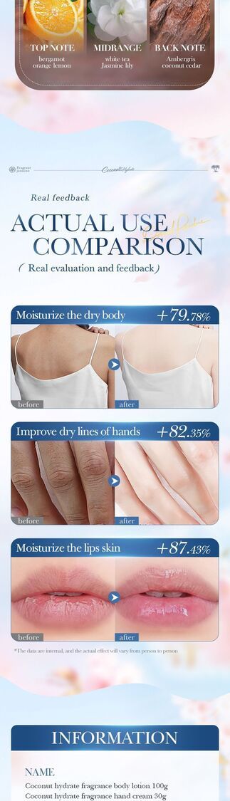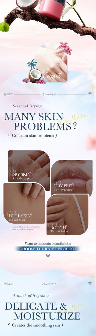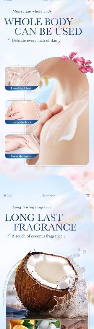 清爽的椰子精華香氛,深層滋潤緊緻肌膚,改善乾燥粗糙的膚質,讓肌膚柔軟光滑。