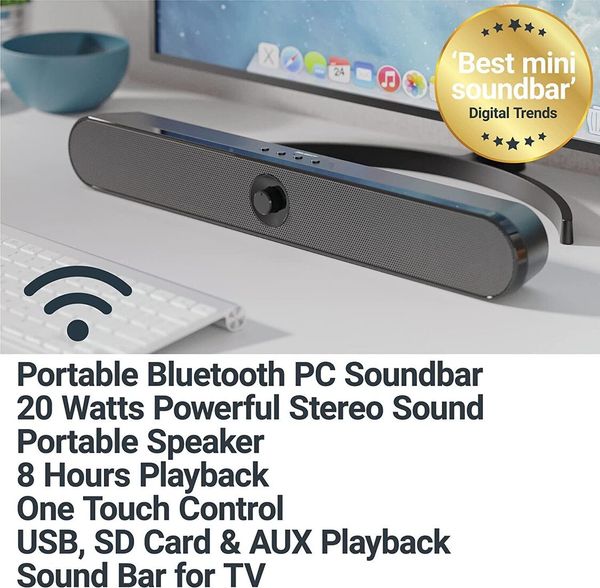 強大的揚聲器:纖薄緊湊的設計可完美融入您的計算機空間,讓聆聽質量無後顧之憂。無論您是在尋找便攜式揚聲器來升級您的家庭娛樂體驗,還是想將派對帶到戶外,無線條形音箱都可以隨身攜帶。 Atlas 強大的 2.0、20 瓦立體聲揚聲器配備兩個 2.2 英寸全頻喇叭及兩個低音震膜,可為任何場合帶來影院級音效。