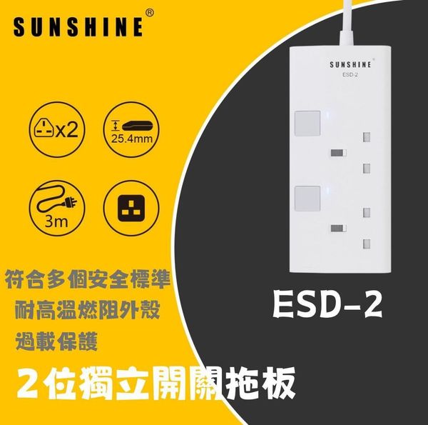 陽光-SUNSHINE ESD-2 (446100)13A 兩位獨立開關安全拖板連LED指示燈(白色)(連3米線) 防雷拖板 | 電源插座 | 排插 | 排蘇
