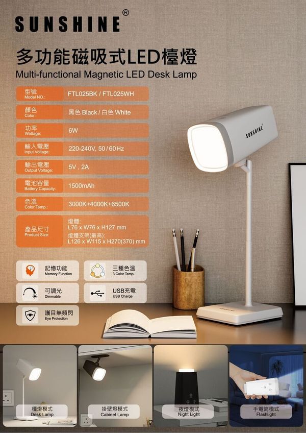 陽光-SUNSHINE FTL025BK (448869)LED可充電多功能磁吸式檯燈 6W 黑色 3000-6500K+可調光暗 #掛牆燈 #書檯燈 #床頭燈 #露營燈 #小夜燈 #電筒 #枱燈