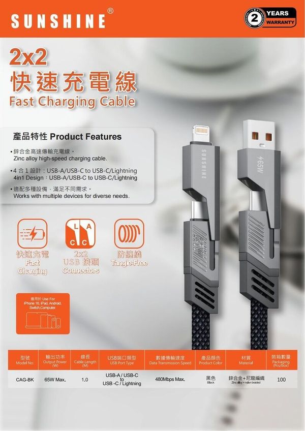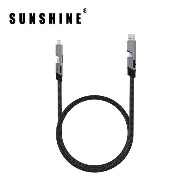 陽光-SUNSHINE CAG-BK PD65W(450350) 1米四合一黑色尼龍編織資料線 USB-A/USB-C轉USB-C/Lightning #快充線 適用於iPhone 17