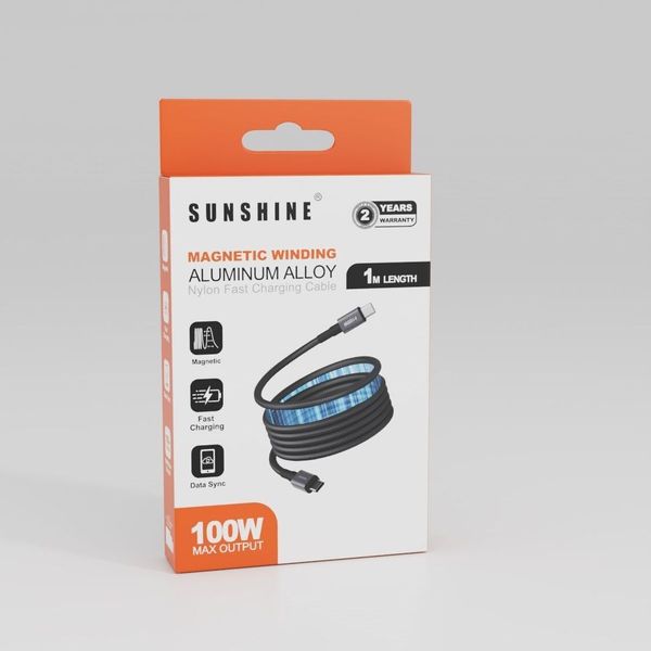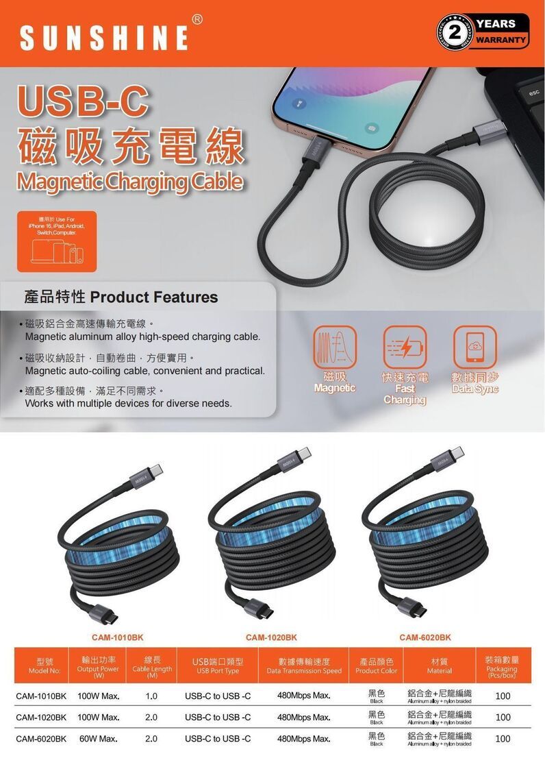 陽光-Sunshine CAM-1010BK (450374)PD100W 1米長磁吸充電線 USB-C轉USB-C (黑色) #磁能線 #快充線 適用於iPhone 17