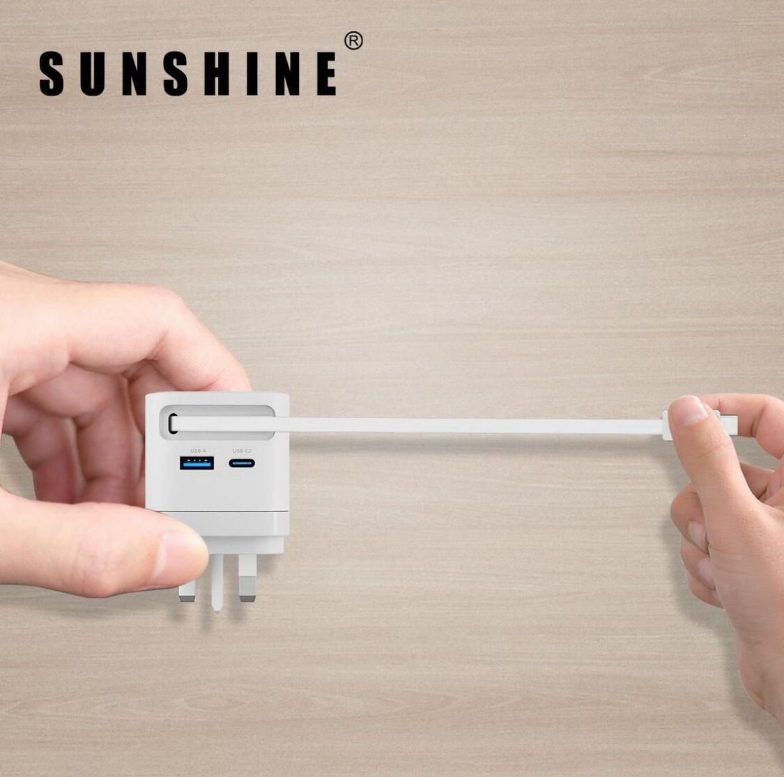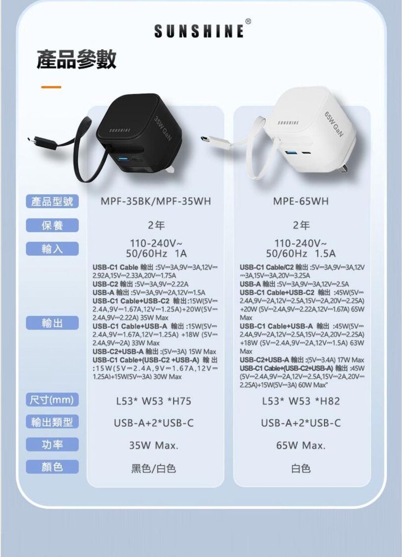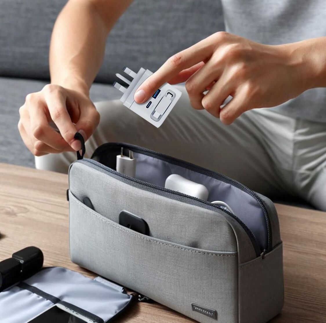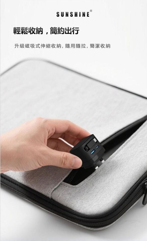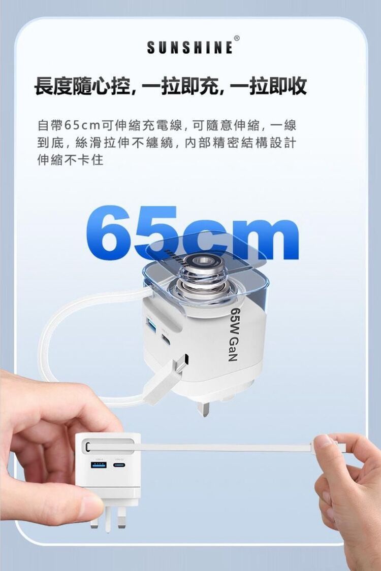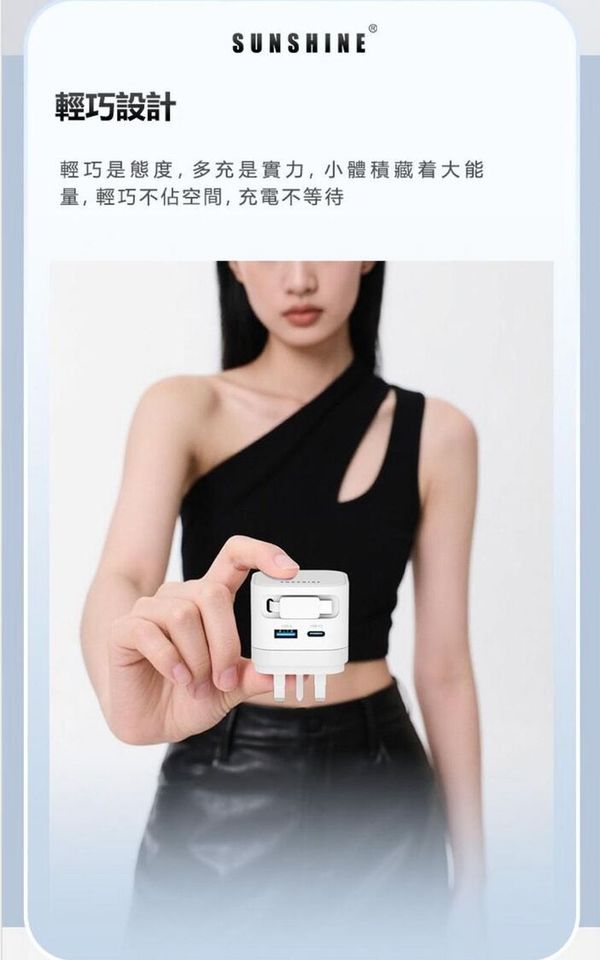 - 巧小設計,內置可以伸縮的USB-C快充線 及 1個 USB-C & 1個 USB-A